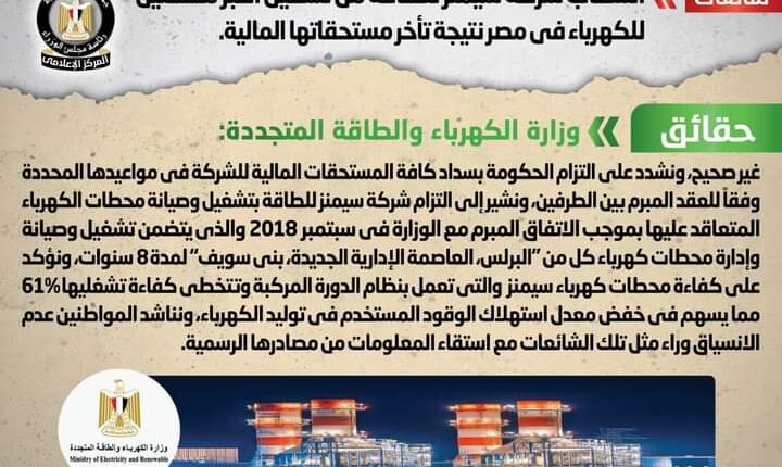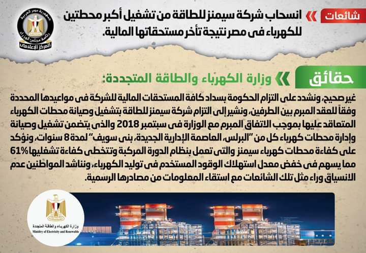 انتشر في بعض صفحات التواصل الاجتماعي أنباء بشأن انسحاب شركة سيمنز للطاقة من تشغيل أكبر محطتين للكهرباء في مصر نتيجة تأخر مستحقاتها المالية، وقد قام المركز الإعلامي لمجلس الوزراء بالتواصل مع وزارة الكهرباء والطاقة المتجددة، والتي نفت تلك الأنباء، مُؤكدةً أنه لا صحة لانسحاب شركة سيمنز للطاقة من تشغيل أكبر محطتين للكهرباء في مصر نتيجة تأخر مستحقاتها المالية، مشددةً على التزام الحكومة بسداد كافة المستحقات المالية للشركة في مواعيدها المحددة وفقاً للعقد المبرم بين الطرفين، مشيرةً إلى التزام شركة سيمنز للطاقة بتشغيل وصيانة محطات الكهرباء المتعاقد عليها بموجب الاتفاق المبرم مع الوزارة في سبتمبر ٢٠١٨ والذي يتضمن تشغيل وصيانة وإدارة محطات كهرباء كل من “البرلس، العاصمة الإدارية الجديدة، بني سويف” لمدة 8 سنوات، مؤكدة على كفاءة محطات كهرباء سيمنز والتي تعمل بنظام الدورة المركبة وتتخطي كفاءة تشغليها 61% مما يسهم في خفض معدل استهلاك الوقود المستخدم في توليد الكهرباء، مناشدةً المواطنين عدم الانسياق وراء مثل تلك الشائعات مع استقاء المعلومات من مصادرها الرسمية.