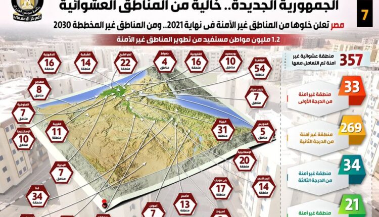 وفي هذا الصدد نشر المركز الإعلامي لمجلس الوزراء تقريراً تضمن إنفوجرافات تسلط الضوء على أن الجمهورية الجديدة ستكون خالية من المناطق العشوائية مع إعلان مصر خلوها من المناطق غير الآمنة نهاية 2021، ومن المناطق غير المخططة في 2030، وذلك في إطار جهود توفير سكن آمن وكريم لكل المصريين.