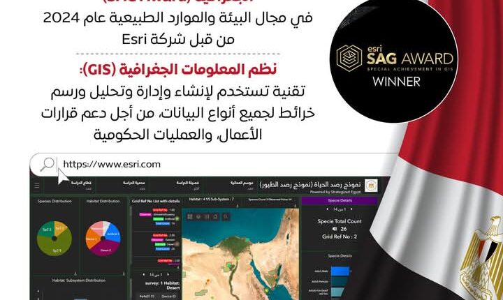 حصل جهاز شؤون البيئة على جائزة التميز في نظم المعلومات الجغرافية (SAG Award) في مجال البيئة والموارد الطبيعية لعام 2024، والتي تمنحها شركة Esri، الرائدة عالميًا في مجال برمجيات نظم المعلومات الجغرافية (GIS) وتحليل المواقع ورسم الخرائط.