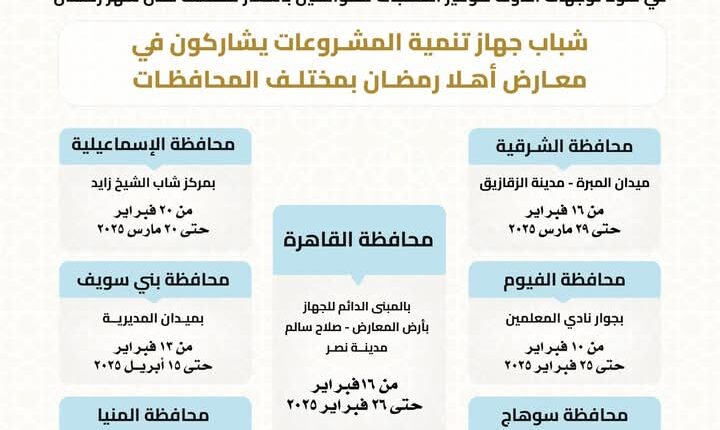 جدير بالذكر أنه تقرر إقامة معرض الشرقية بميدان المبرة بمدينة الزقازيق خلال الفترة من 16 فبراير حتى نهاية شهر رمضان، بينما تقرر إقامة معرض الإسماعيلية بمركز شباب الشيخ زايد خلال الفترة من 20 فبراير وحتى 20 مارس، وتقرر إقامة معرض الفيوم بجوار نادي المعلمين خلال الفترة من 10 فبراير وحتى 25 فبراير، وتقرر إقامة معرض بني سويف بميدان المديرية خلال الفترة من 13 فبراير وحتى 15 أبريل ومعرض سوهاج بميدان الثقافة من 15 فبراير وحتى 27 فبراير ومحافظة المنيا بمركز التشييد والبناء بكورنيش النيل في الفترة من 17 فبراير وحتى 28 فبراير، على أن تفتح معارض أهلا رمضان بهذه المحافظات أبوابها للجمهور يوميا من الساعة 10 صباحا وحتى الساعة 10 مساءا.