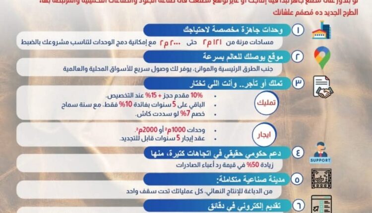 وتأكيدًا على دعم الدولة للمستثمرين، عقدت الوزارة شراكة مع البنك المصري لتنمية الصادرات، الراعي الرسمي لهذا الطرح، لتوفير حزمة تمويل متكاملة تشمل تمويل شراء الوحدات بنسبة تصل إلى 90% من قيمتها ولمدة سداد حتى 10 سنوات، فضلًا عن تمويل الآلات والمعدات لفترة سداد تصل إلى 7 سنوات، مع تقديم دعم فني وتصديري للمصدرين والراغبين في النفاذ إلى الأسواق الخارجية.