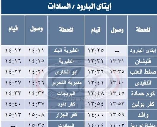 حيث تقرر اعتباراً من يوم الثلاثاء الموافق 5 / 8 / 2025 تشغيل قطار رقم 724 / 725 ( إيتاى البارود – السادات ) وقطار رقم 727 / 726 ( السادات / إيتاى البارود ) ، وتعمل جميع أيام الأسبوع ماعدا يوم الجمعة والعطلات الرسمية وطبقاً للجداول المرفقة .