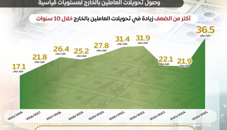 وأظهرت الإنفوجرافات أن التحويلات كانت قد سجلت 21.9 مليار دولار عام 2023/2024، و22.1 مليار دولار عام 2022/2023، و31.9 مليار دولار عام 2021/2022، و31.4 مليار دولار عام 2020/2021.