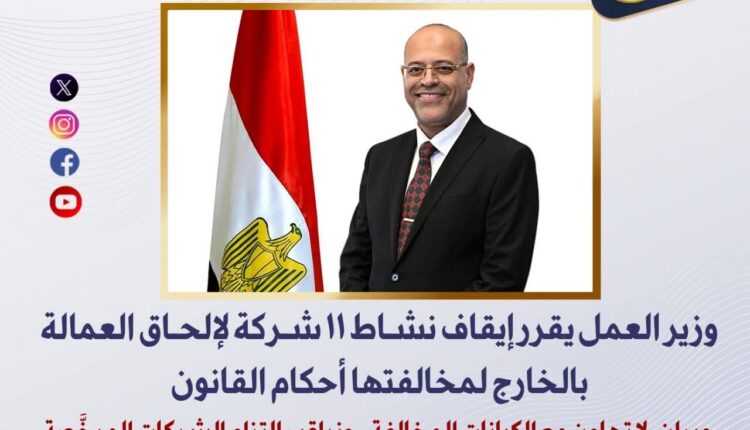 أعلن وزير العمل محمد جبران ،عن إيقاف نشاط 11 شركة لإلحاق العمالة بالخارج بعد رصد مخالفات قانونية تستوجب اتخاذ هذا الإجراء.