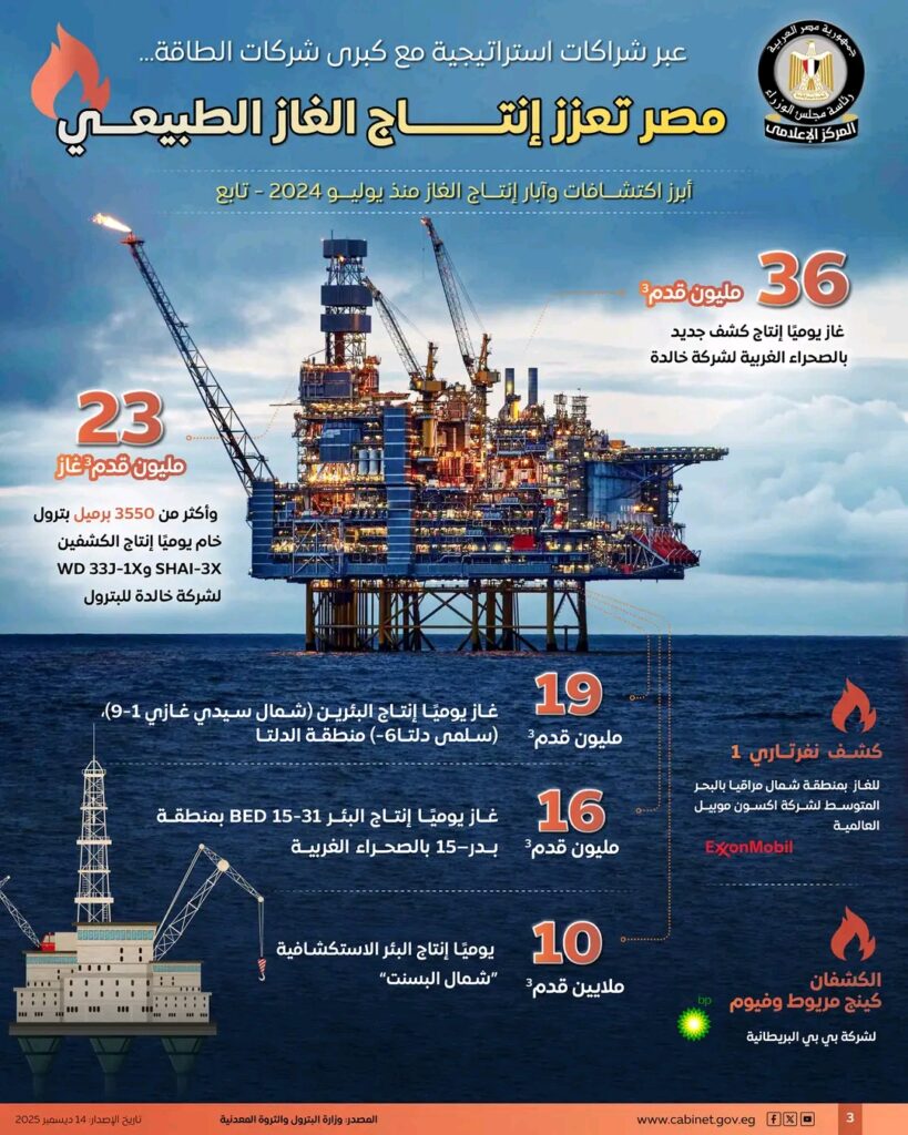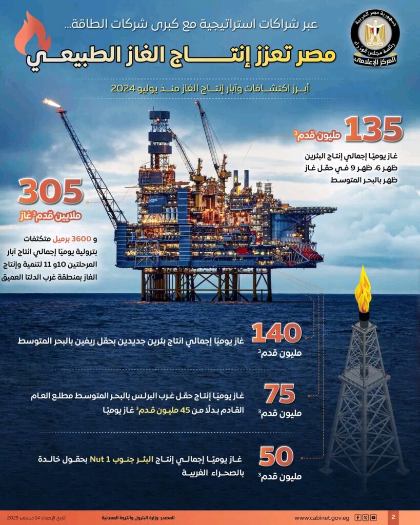 بالإنفوجراف | شراكات عالمية واستثمارات مليارية تدفع مصر لتعزيز إنتاج الغاز وترسيخ مكانتها كمركز إقليمي للطاقة