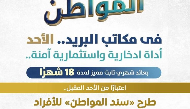 تبدأ وزارة المالية اعتبارًا من الأحد المقبل طرح «سند المواطن» للأفراد من خلال مكاتب البريد المنتشرة في جميع أنحاء الجمهورية، كأداة ادخارية واستثمارية آمنة بعائد شهري ثابت ولمدة 18 شهرًا، مع إمكانية الاسترداد بسهولة ودرجة أمان مرتفعة.