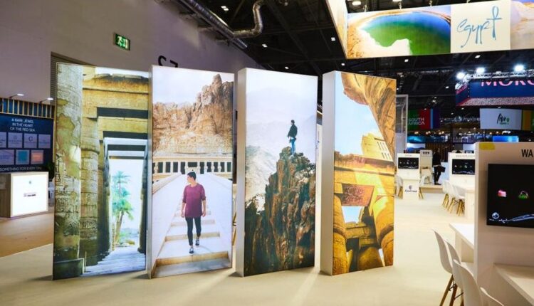 الجناح المصري مُصمم علي شكل معبد ويشارك فيه مصر للطيران و47 شركة وفندق