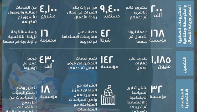 وفي إطار المحور الفرعي الثاني المتعلق بتعزيز فرص العمل وتمكين الشباب والفتيات من جميع شرائح المجتمع من الحصول على فرص عمل أكثر وأفضل، تم تنفيذ العديد من البرامج التي حققت نتائج فعالة من بينها تلقى أكثر من 1.185 مليون مستفيد تدريبًا على مهارات العمل المباشرة، وزيادة وصول آلاف الشباب والفتيات على فرص العمل من خلال تدخلات دعم سلسلة القيمة و وبرامج التدريب العملي، إلى جانب دعم 142 مؤسسة لتقديم خدمات لفرص عمل أكثر وأفضل، وإيجاد أكثر من 430,000 فرصة عمل من خلال الشراكة مع جهاز تنمية المشروعات المتوسطة والصغيرة ومتناهية الصغر.