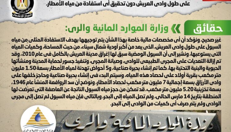 وقام المركز الإعلامي بالتواصل مع وزارة الموارد المائية والري، والتي نفت تلك الأنباء، مُؤكدةً أنه لا صحة لإهدار مليارات الجنيهات على إنشاء حواجز الحماية من أخطار السيول على طول وادي العريش دون تحقيق أي استفادة من مياه الأمطار، وأن أي مخصصات مالية خاصة بهذا الشأن يتم توجيهها بهدف الاستفادة المثلى من مياه السيول على طول وادي العريش، الذي يعد من أكبر أودية شمال سيناء، من حيث المساحة، وكميات المياه التي يستوعبها، مُشيرةً إلى أن السيول الومضية سبق لها إغراق مدينة العريش بالكامل في عام ٢٠١٠، وقد تم إزالة التعديات على المجرى الطبيعي للوادي، وصيانة المجرى، وتنفيذ جسور لحماية المدينة ومنشآتها الحيوية والبنية التحتية بها، كما تم إنشاء بحيرة صناعية، و٥ أحواض تهدئة لمياه الأمطار بسعة ١.٥٠ مليون متر مكعب بقرية أولاد علي لحصاد هذه المياه، وسيتم البدء في إنشاء بحيرة صناعية وحاجز خلفها على وادي الأرزاق بسعة إجمالية ٧ مليون متر مكعب لحصاد الأمطار، مُوضحةً أن سد الروافعة المنشأ عام ١٩٤٦ بسعة تخزينية ٥.٢٠ مليون متر مكعب، قد تمكن من حجز مياه السيول الناتجة عن العاصفة، التي تعرضت لها المنطقة بتاريخ ١٤ مارس الحالي، ولم تصل المياه إلى البحر، وبالتالي فإن مياه السيول لم تصل إلى مجرى الوادي ولم يتم صرف أي كميات من الوادي إلى البحر.