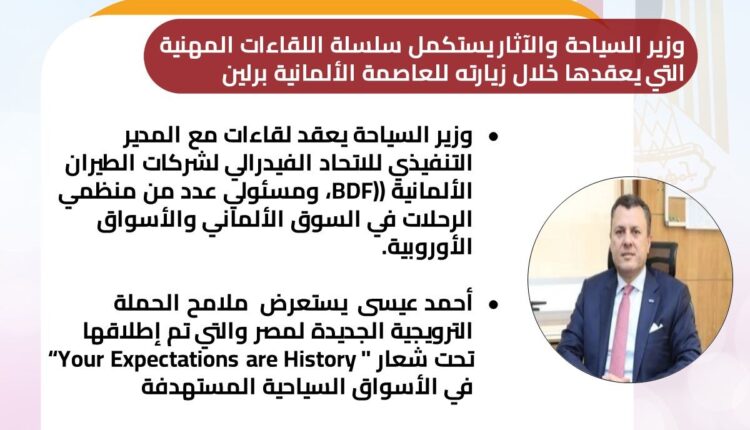 جدير بالذكر أن الوزير كان قد عقد على مدار اليومين الماضين عدد من اللقاءات المهنية، حيث التقى برئيس اتحاد صناعة السفر الألماني (DRV)، ورئيس اتحادات وكلاء السفر ومنظمي الرحلات الأوروبية (ECTAA)، ومسئولي عدد من كبار منظمي الرحلات وشركات الطيران في السوق الألماني وغيره من الأسواق الأوروبية.